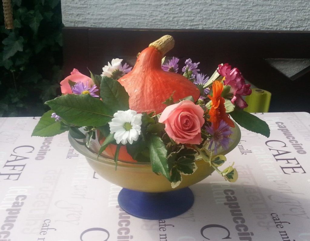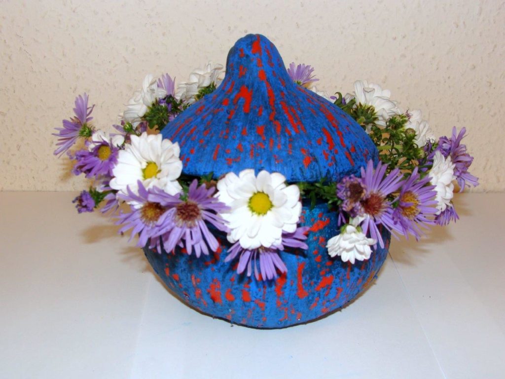 BUČKA KOT VAZA. Bučko hokaido prerežemo na 2/3 višine tako, da dobimo posodo in pokrov. To nekoliko izdolbemo. V bučo vstavimo cvetličarsko gobo, ki smo jo dobro napojili z vodo. Vanjo smo nato zapičili rože . Bučo lahko tudi pobarvamo z tempero barvo. Taka dekoracija se lepo poda na vrtno mizo, lahko pa krasi tudi stanovanje.