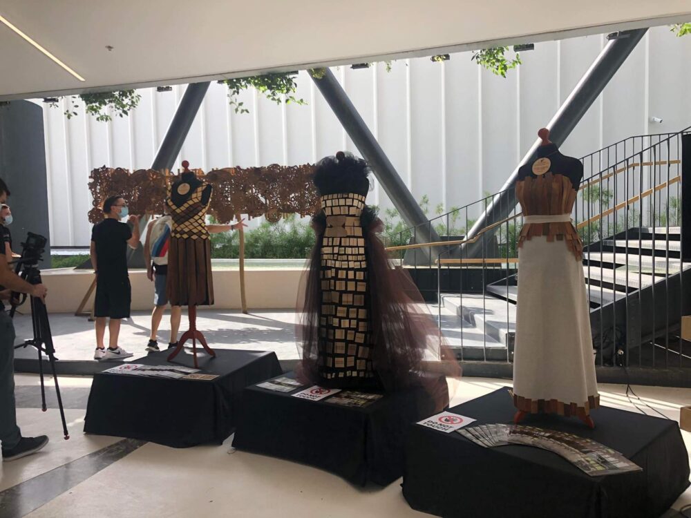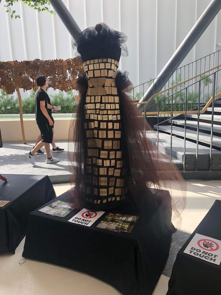 V Dubaju smo razen postavitve razstave izdelkov izvedli tudi praktično delavnico ter prikazali, kako na inovativen način ustvarimo večerno obleko z modelacijo na lutki s kombinacijo tekstilnih materialov ter različnih vrst lesa. Pri svojem delu smo uporabili samo les, ki raste v slovenskih gozdovih. Obleka, ki smo jo izvedli na delavnici: