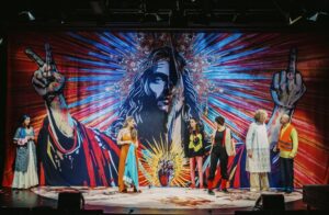 Princip karakterizacije likov spominja na commedio dell’arte, igralci jih utelesijo s poudarjenimi gestikulacijami, dialektom, značilnostjo govora in podobnim, kar v gledalcih sproža smeh. Katarina Stegnar ob prizorih problematizira politično nekorektnost. Prikazuje delovanje Jezusa Kristusa, velikega rešenika človeštva, skozi pogled slehernika, ki še dva tisoč let po njegovem vstajenju ni odrešen. Predstava je tako med drugim premislek, koliko danes družba, ki je utemeljena na krščanskih vrednotah, zares sledi tistemu, kar je Jezus učil. Srednjeveški misteriji so obravnavali Jezusovo življenje ali življenje svetnikov. Fojev Burkaški misterij obravnava odnos med oblastjo in malim človekom, pri čemer je Fo prizore, ki so jih burkeži izvajali na trgih, posodobil za čas konec 60. let 20. stoletja ter v njih na satiričen način obravnaval strukture italijanske vlade in cerkve. Vse in vsi so v stalnem premiku, vse vrvi, hiti in perpetuira nove domislice, povezane z današnjo percepcijo peripetij o življenju in nauku Jezusa Kristusa. Avtorska ekipa se je besedila, ki so ga prvotno uprizarjali kot monodramo, lotila kolektivno, hudomušno, zasedba se zna, kot vedno, pošaliti tudi iz same sebe in s tem problemsko preizpraševati tudi lastno stališče. Dogajanje se poglablja s kančkom glasbe. Potujoča igralska družina Selitvenega Slovenskega mladinskega gledališča tako duhovite prizore iz Jezusovega življenja preigrava z vidika sedanjosti in z zavedanjem, v kaj vse se je njegov konstruktivni, a naivni optimizem sprevrgel. Burkaški misterij v današnjih gordijsko zavozlanih časih, ki kar kličejo po radikalnem rezu, s pomočjo forme srednjeveških misterijev preizprašuje temelje naših družbenih dogovorov s krščanskim etosom na čelu. Ne glede na prepričanja si vsi želimo živeti v boljšem svetu. Preprosto vprašanje, na katero ne poznamo odgovora, pa je, zakaj tega preprosto ne naredimo. Uprizoritev v celoti učinkuje kot kratkočasna odrska izkušnja, ki si privošči številne šale, ne da bi prestopila meje spoštljivosti, žaljivosti ali navsezadnje kritične distance.