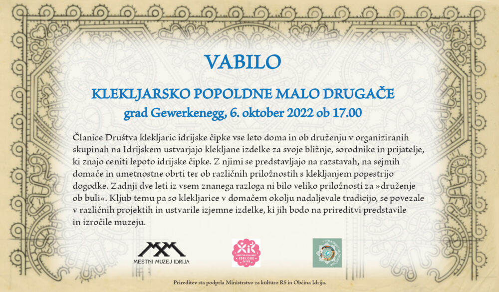 Dogodkovnik Mestni muzej Idrija in Društvo klekljaric idrijske čipke – vabilo Avtor: Dunja Krajnc - 4. oktobra, 2022 0 328