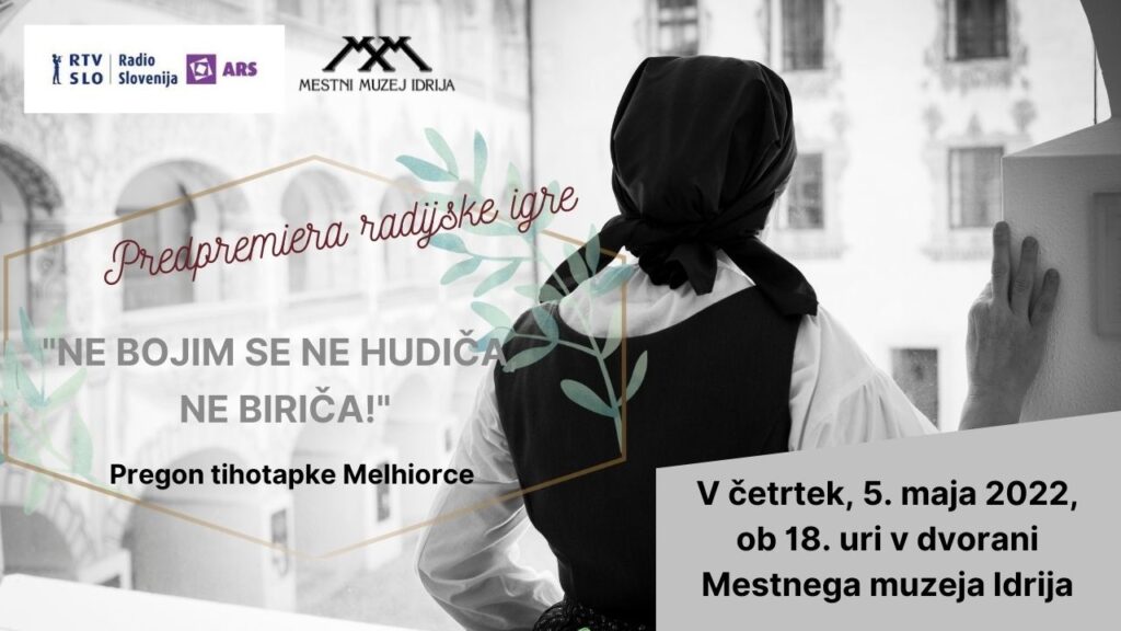 Skupaj z uredništvom igranega programa Radia Slovenija – programom ARS vas vabimo na predpremierno poslušanje nove radijske igre o tihotapki Melhiorci, ki bo v četrtek, 5. maja 2022, ob 18. uri v dvorani Mestnega muzeja Idrija na gradu Gewerkenegg. Več…