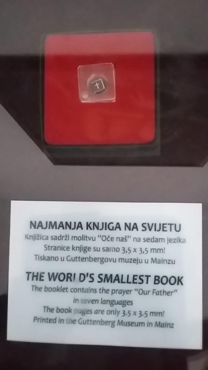 V samostanu na otoku Visovcu na Krki se nahaja najmanjša knjiga na svetu. Velika je komaj 3,5 x 3,3 mm. Vsebuje molitev „Oče naš“ na sedmih jezikih. Tiskana je v Guttebergovem muzeju v Mainzu.