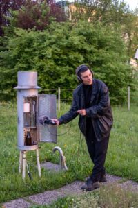 Umetnica kot izhodišče raziskovanja izbere vremenski balon – vsakodnevni instrument meteoroloških merjenj, ki poslušalke in poslušalce popelje na imaginarno atmosferično potovanje od tal v ozračje in nazaj. Štiridesetminutna kompozicija združuje posnetke meteoroloških instrumentov, terenske in studijske posnetke ter intervjuje s strokovnjaki, prepletene z umetničinim glasom, ki sledi dvigovanju, raztezanju, prelomu in pristanku balona. Zvočno potovanje se bo začelo pod grajsko vzpenjačo, nadaljevalo v vzpon na grad in se razprlo v senzorično izkušnjo, ki prepleta dokumentarnost znanosti in poetičnost umetnosti.