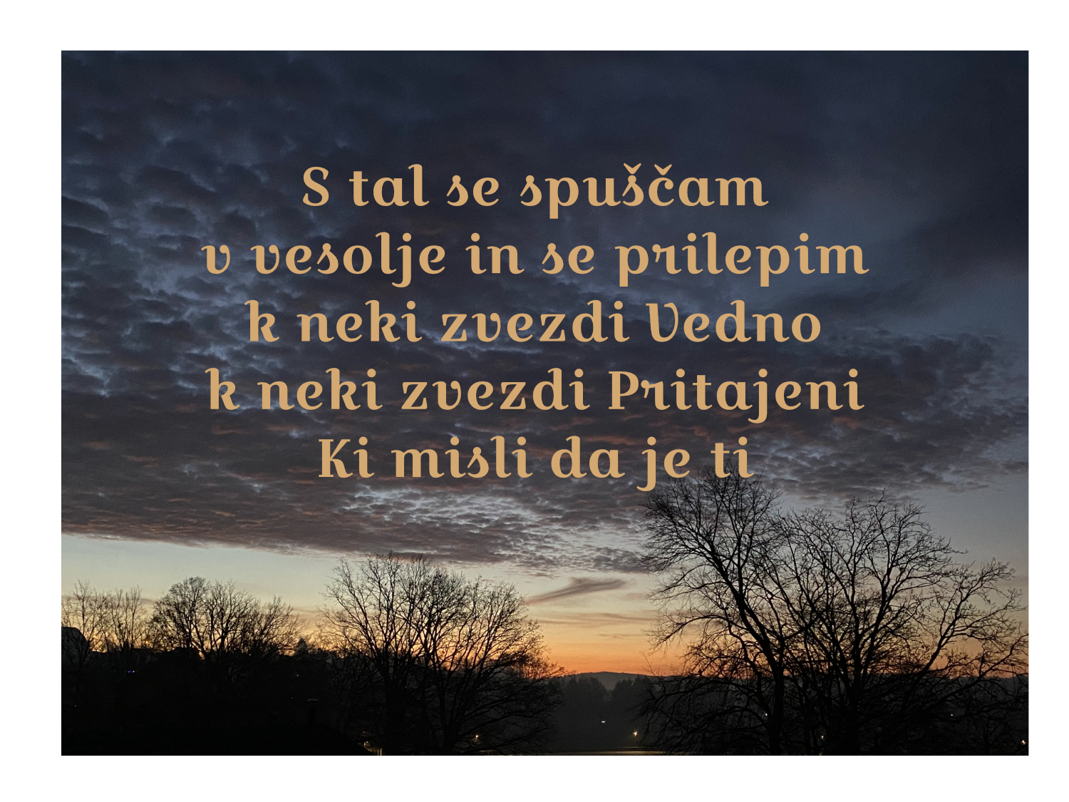 KulturaPoezija Sonja Votolen: Med zvezdami nisi Avtor: Sonja Votolen - 24. aprila, 2021 0 428 Avtorica fotografije: Mojca Fingušt Rup