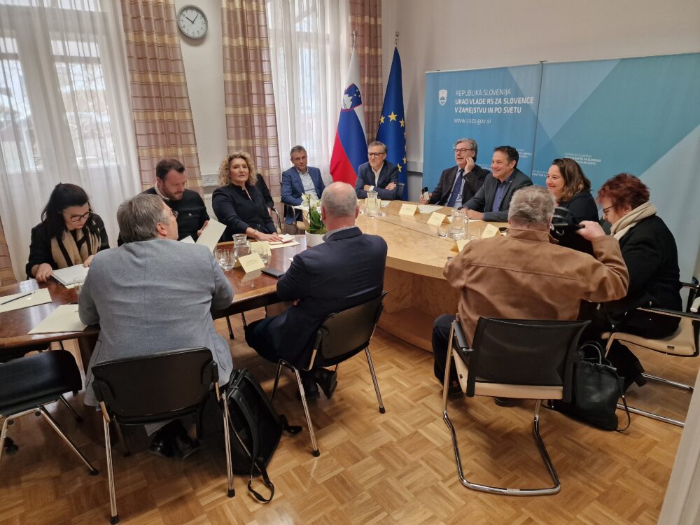 Na Uradu Vlade Republike Slovenije v zamejstvu in po svetu je danes z ministrom za Slovence v zamejstvu in po svetu Matejem Arčonom in državno sekretarko na uradu Vesno Humar potekalo srečanje dveh narodnih skupnosti – slovenske v Italiji in italijanske v Sloveniji.Srečanje, ki so ga z veliko naklonjenostjo pozdravili vsi udeleženci, minister Arčon pa ga je že uvodoma označil za sestanek sinergij, je bilo v prvi vrsti namenjeno razpravi o priložnostih na področju podpore gospodarski osnovi obeh avtohtonih narodnih manjšin. Beseda je prav tako tekla o razvojnem potencialu, ki ga prinaša Evropska prestolnica kulture GO! 2025. Sogovorniki so bili po zaključku vsebinsko bogatega in konstruktivnega pogovora soglasni glede dveh pomembnih sklepov današnjega sestanka. Kot prvo so sklenili, da se pripravi celovit, dolgoročni program vzpodbujanja gospodarskega razvoja na čezmejnem, narodnostno mešanem območju na meji med Slovenijo in Italijo. V procesu bodo sodelovali predstavniki obeh manjšin in predstavniki drugih vladnih služb. Osnovno izhodišče je vzpostavitev dogovora o zrcalnih ukrepih Republike Slovenije in Republike Italije ter Avtonomne dežele Furlanije Julijske krajine. Kot drugo, pa so bili skladni, da se vzpostavi redna operativna srečanja med predstavniki obeh manjšin, ki bodo prostor za prenos informacij ter oblikovanje podlag in izhodišč za bilateralne pogovore na ravni Slovenija – Italija in Slovenija – Furlanija Julijska krajina. Predstavniki manjšin so se strinjali, da je potrebno že sedaj odlično sodelovanje še poglobiti in ustaliti.V izjavi za medije po zaključku današnjega srečanja je minister Arčon poudaril, da se je tekom sestanka izoblikovalo skupno stališče, da »se ciljno bolj usmerimo v projekte, ki bi nas povezovali. Pri tem smo se osredotočili na projekte na področju gospodarstva in razvoja turizma,« ter dodal, da pa se bo v prihodnje izkazalo o najprimernejši obliki tega sodelovanja. V tem trenutku je pomembno izoblikovati predvsem vsebino. Minister je izpostavil tudi strategijo razvoja turizma, ki je že pripravljena za območje Benečije. »Mislim, da je to ena krasna osnova,« je povedal in spomnil, da sta se, na srečanju pretekli teden, o tem strinjala tudi s predsednikom Avtonomne dežele Furlanija-Julijska krajina Massimilianom Fedrigo.Današnjega sestanka so se udeležili senatorka Italijanske Republike Tatjana Rojc, poslanec Državnega zbora Republike Slovenije Felice Žiža, državni sekretar v kabinetu predsednika Vlade RS Vojko Volk, direktor Urada Vlade RS za narodnosti Stane Baluh, predsednik Sveta slovenskih organizacij Walter Bandelj, predsednica Slovenske kulturno gospodarske zveze Ksenija Dobrila, predsednik Obalne samoupravne skupnosti italijanske narodnosti Alberto Scheriani, predsednica Občinske  samoupravne skupnosti italijanske narodnosti Izola Vita Valenti, sekretar Občinske samoupravne skupnosti italijanske narodnosti Koper Marco Loredan, svetovalec senatorke in politični analitik Rudi Pavšič ter predstavnica Ministrstva za zunanje in evropske zadeve.