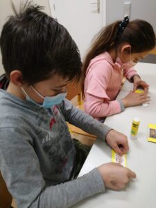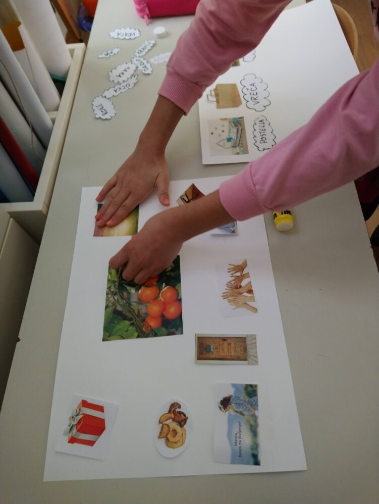• V dveh izvodih smo narezali kvadratke in na njih prilepili sličice. Le-te smo našli na spletu. Na en izvod smo prilepili sličico in zapisali besedo v slovenskem jeziku, na drugi izvod pa enako sličico z romskim zapisom besede.