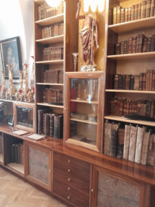Pater Bernard nas je popeljal po samostanski knjižnici in muzeju, kjer je zbranih preko 3000 dragocenih knjig iz obdobja pred letom 1800, najstarejše so celo iz 15. stoletja. Med dragocenejšimi je prva tiskana knjiga o fiziki iz leta 1574. Iz časa redovnikov avguštincev se je ohranilo le malo knjig, saj so jih ti ob svojem odhodu večino odpeljali. Frančiškani, ki so se tukaj naselili leta 1854, so precej starih knjig prinesli s seboj iz avstrijskih samostanov. Velik del knjižne zbirke pa je iz nekdanjega frančiškanskega samostana v Brežicah, kjer so se redovniki naselili že v 14. stoletju. Knjižnico so skozi stoletja dopolnjevali z vedno novimi knjigami in jo tako precej povečali. Danes je dostopna javnosti, ogledajo si jo lahko romarji, turisti in drugi.