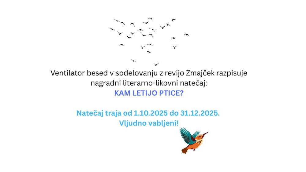 Ventilator besed, revija za kulturo, vzgojo in izobraževanje www.ventilatorbesed.com v sodelovanju z Revijo Zmajček, organizira nagradni likovno-literarni natečaj na temo KAM LETIJO PTICE?, in sicer v obdobju od 1.10.2025 do 31.12.2025.
