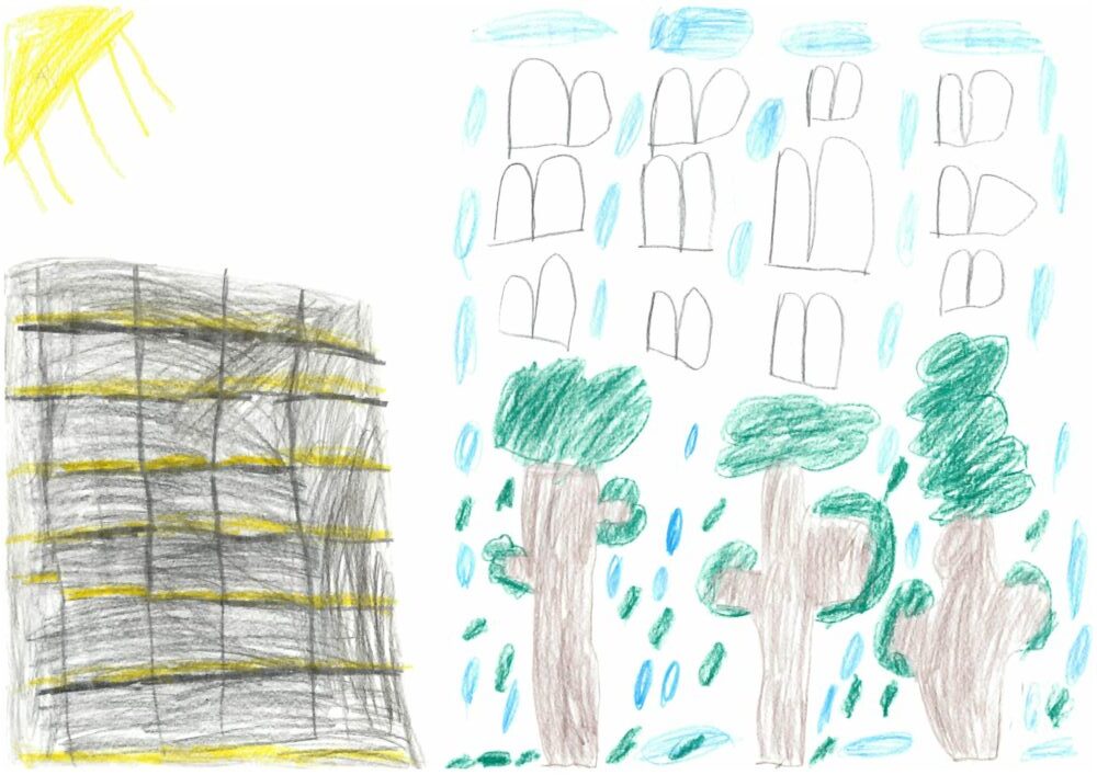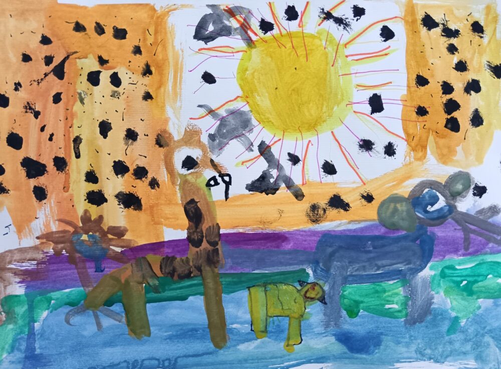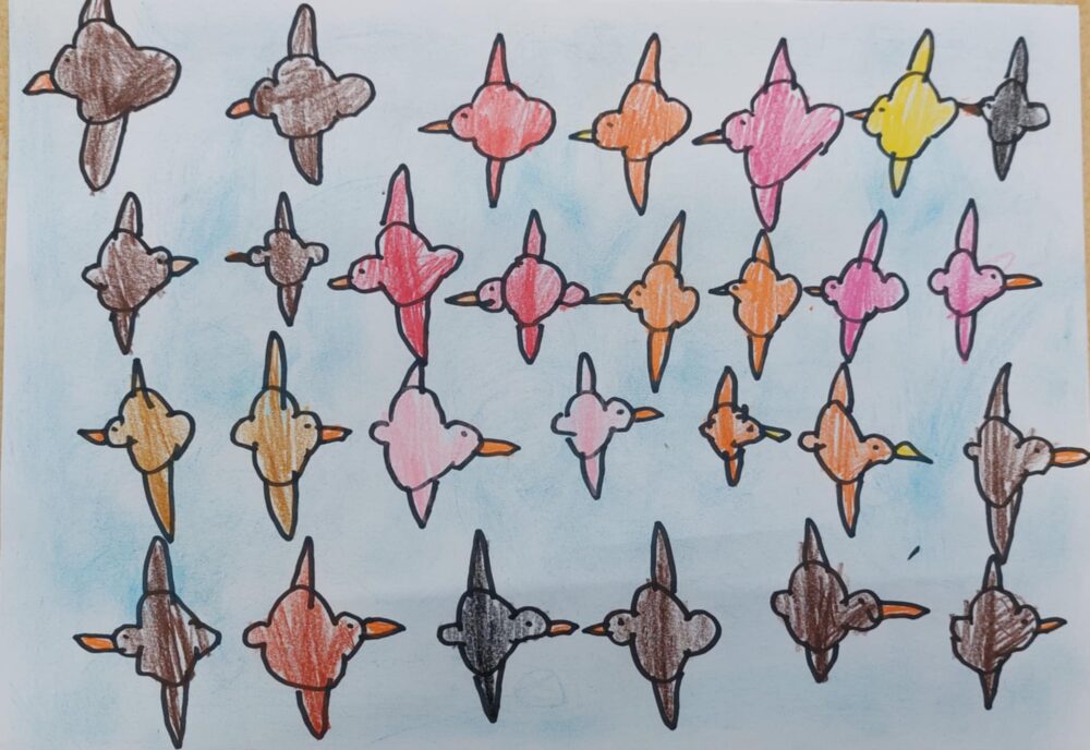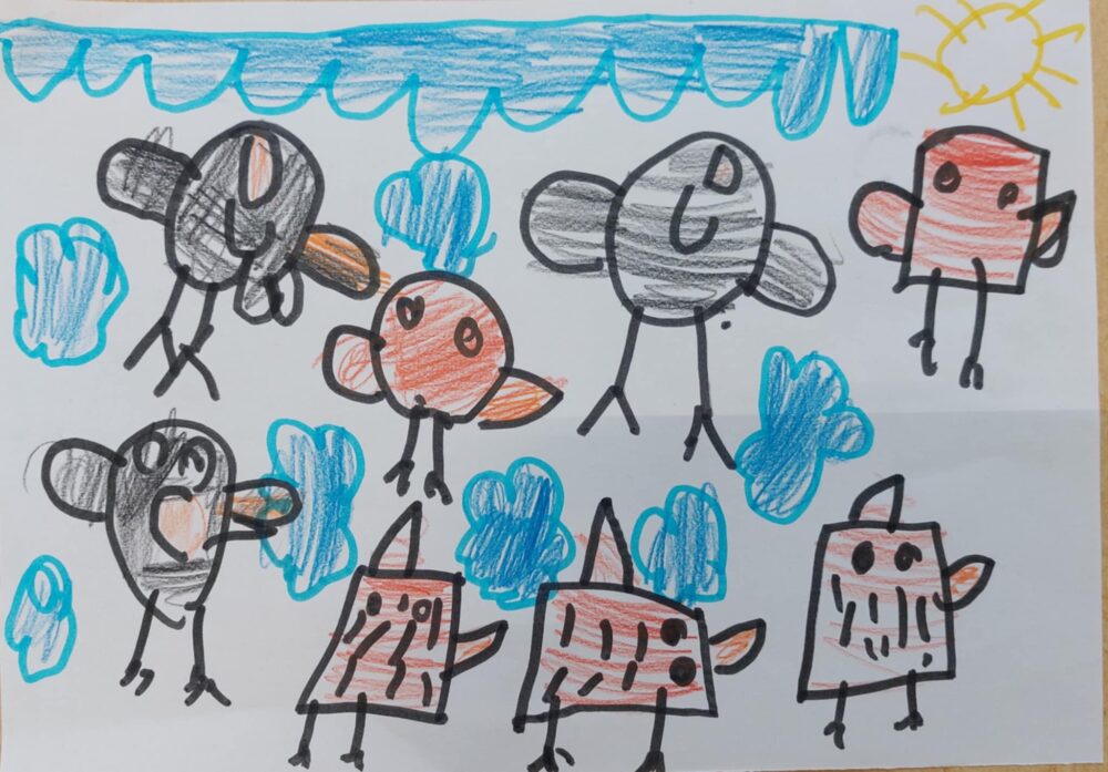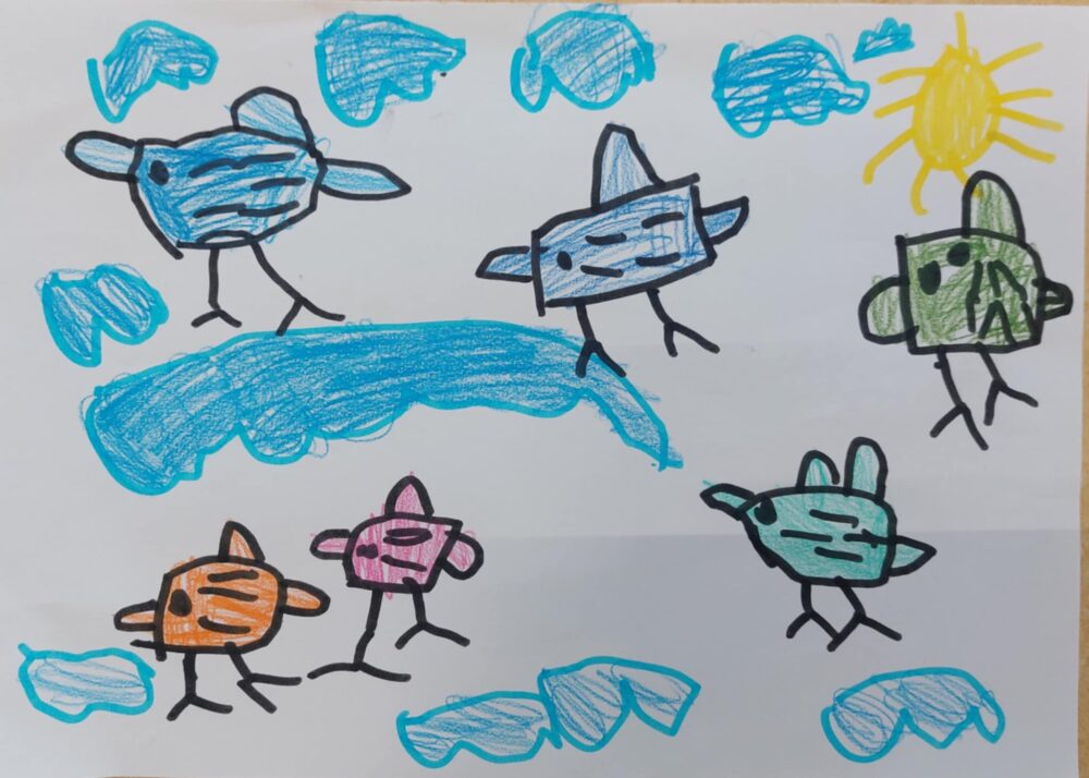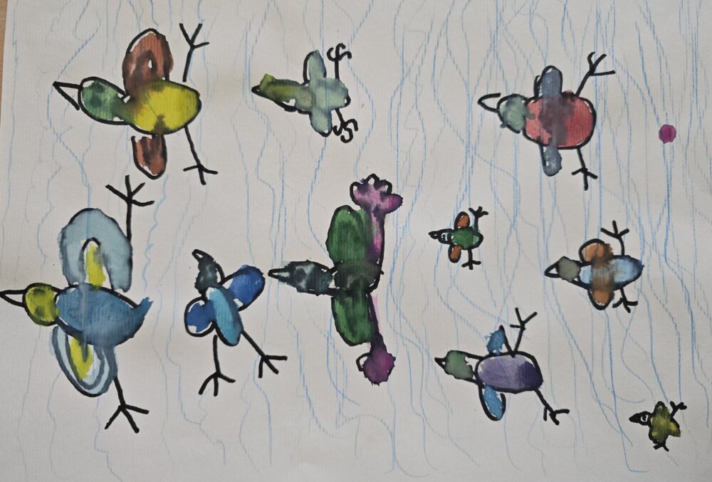 6. Kam letijo ptice, avtor Luize Juhart, starost 5 let/ mešana tehnika/ mentorici vzgojiteljici Aleksandra Andrić, Darja Svetlin Kovič, Vrtec Domžale, enota Palček, skupina Metulji.