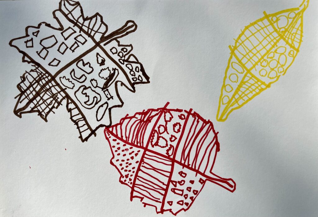 Krištof je ustvaril dve želvici in tako v jesenske dni priklical spomin na poletje, ko je v bližnjem bajerju opazoval želvice, ki so plavale med ločjem in se sončile na plavajočem hlodu. Uporabila sva jesensko listje, za okvir pa kostanj in ježice ter lešnike in vejice z domačega vrta.