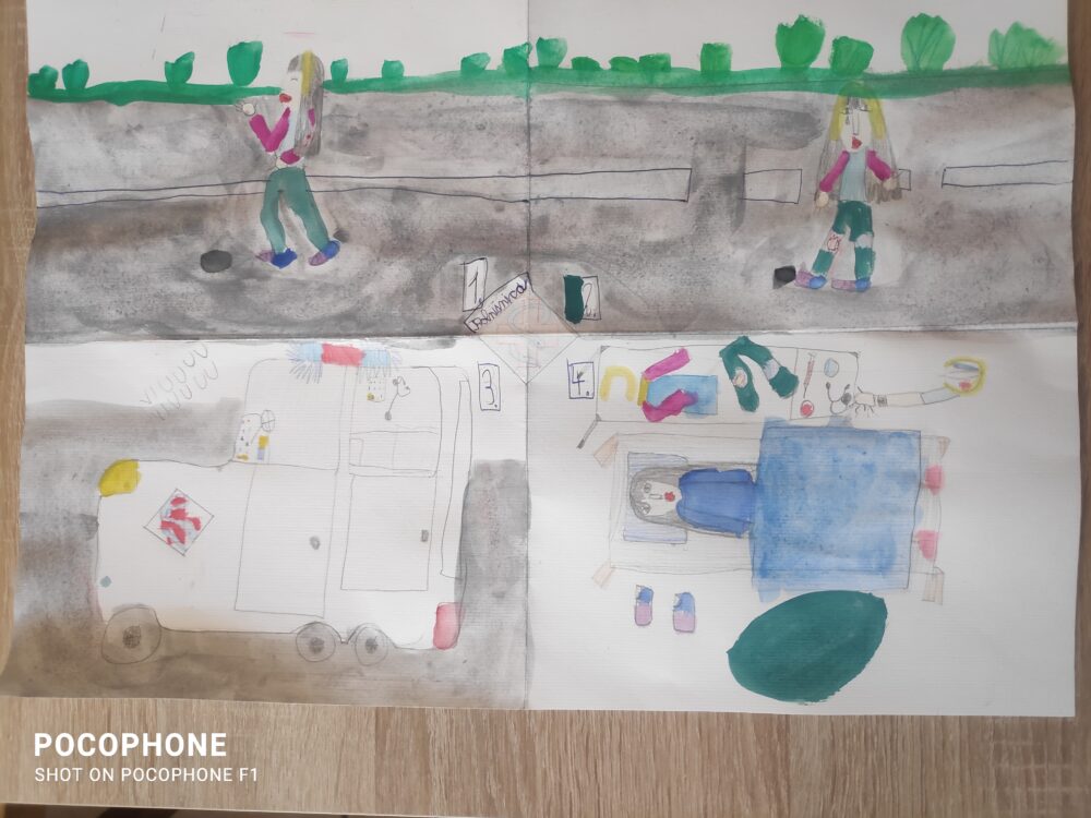 20. Od teka do bolnice, avtorica: Valentina Depolli, 8,5 let, Likovna tehnika: vodene barvice, svinčnik in barvice, Mentorica: mama Anja Novak Depolli