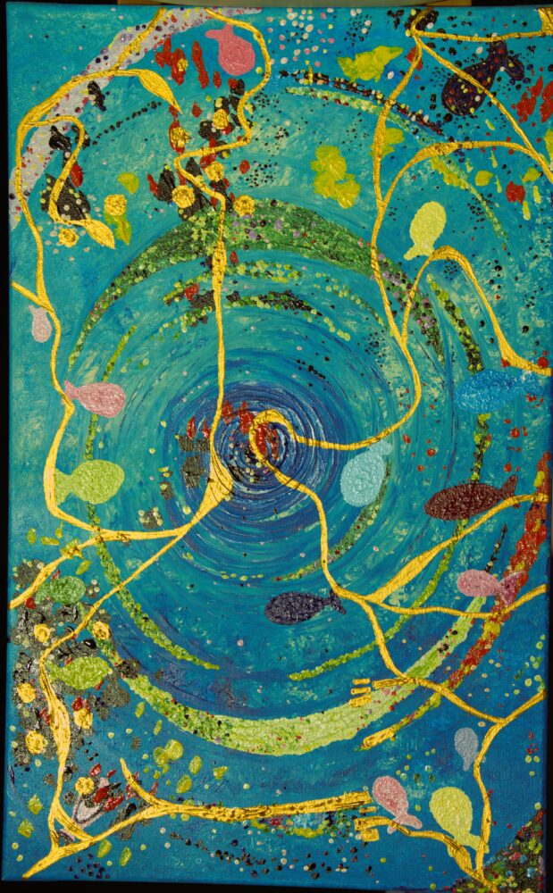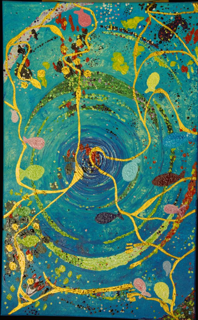 je začutila hvaležnost. Hvaležna je bila, da so ji ostale ribice pomagale in iz nje spravile težko kamenje, ki ga sama ni mogla. Ko je tako premišljevala in čustvovala, ji je poseben zlat prah napolnil srce in oči in ji pokazal nekaj veličastnega. Za čisto majhen trenutek je zagleda kako ribice povezuje žareča zlata nitka. Čisto vsaka ribica je imela na repku pripeto zlata nitko, s katero je bila povezana z ostalimi ribicami.