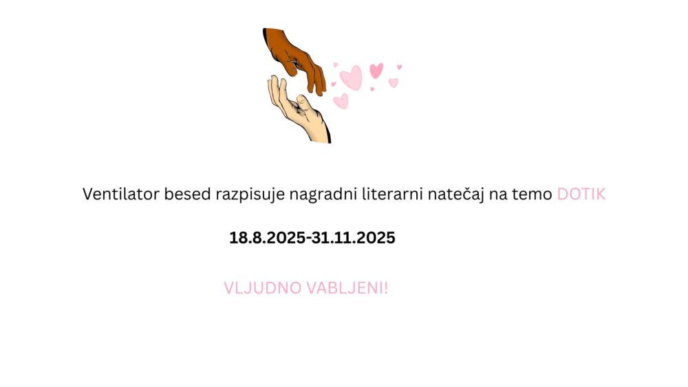 Ventilator besed, revija za kulturo, vzgojo, izobraževanje razpisuje Nagradni literarni natečaj (v obliki pesmi in poezije) na temo DOTIK in sicer v obdobju od 18.08. do 31.12.2025.