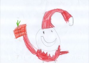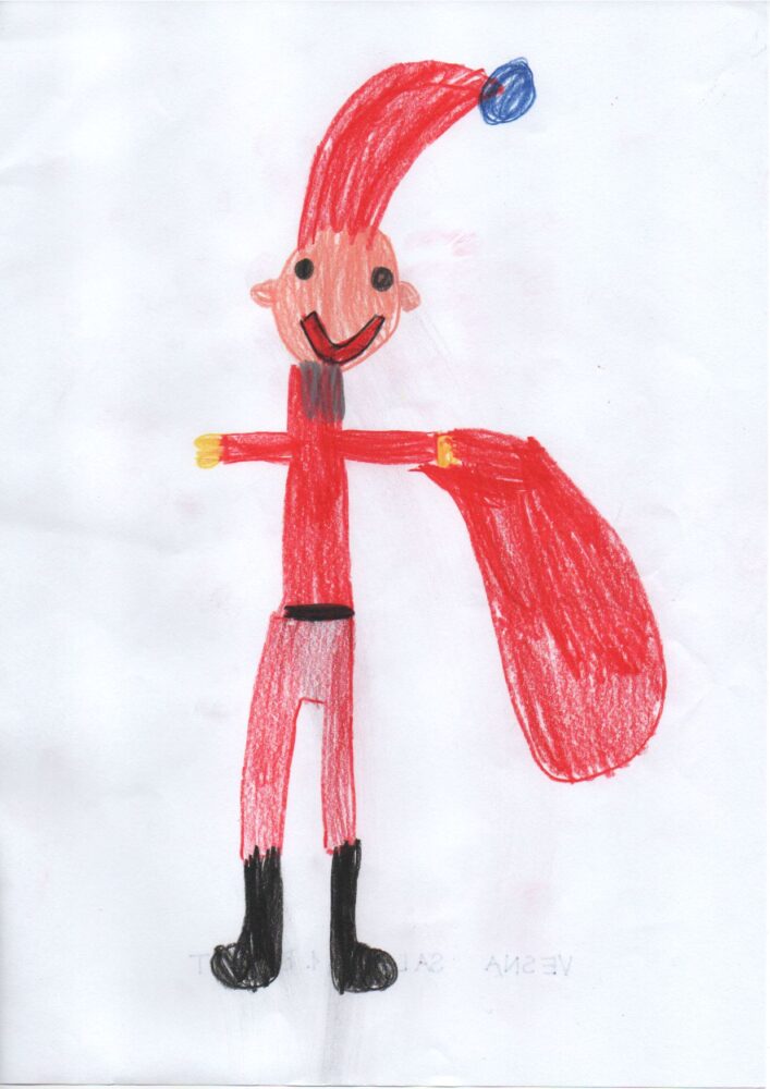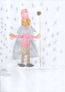 Krištof se zelo veseli decembra in čarobnih dni, ki prihajajo. V decembru bo praznoval 5. rojstni dan. Narisal je Miklavža, ki ima zanj posebno mesto med dobrimi možmi. Prebrala sva slikanico Legenda o svetem Miklavžu, nato pa ga poskušala poustvariti, izdelek je v priponki. Krištofu je Miklavž všeč, ker je tako lepo oblečen in ker pomaga ljudem v stiski. Mentorica: Maruša Malnarič